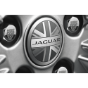 Et særegent monokromt sentermerke med Jaguar-logo og Union Jack-design som gir et britisk preg.